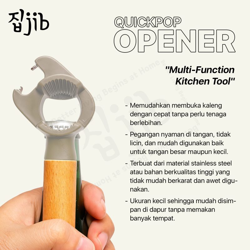 Buka tutup botol atau kaleng jadi super gampang dengan JIB Quickpop Opener! Didesain dengan pegangan kayu kokoh dan multifungsi, alat ini bisa membuka berbagai jenis tutup botol kaca, botol plastik, bahkan kaleng tanpa repot. Praktis, anti slip, dan nyaman digenggam wajib ada di dapur kamu!